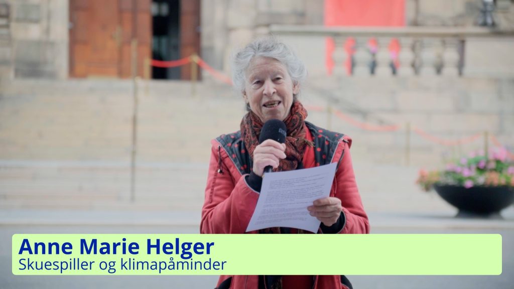 Anne Marie Helger, der udover at være skuespiller også er aktivist i Klimapåmindelsen, præsenterer juryens motivation for at tildele Klimapåmindelsens ærespris til Bornholms Havvind.