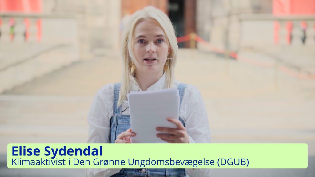 Elise Sydendal fra Den Grønne Ungdomsbevægelse (DGUB) holder grundlovstalen. Hun refererer til strofen fra nationalsangen om, at Danmark skal bestå, så længe bøgen spejler sin top i bølgen blå. Men hvad sker der da med Danmark, hvor bøgen er på kraftig tilbagegang og bølgen ikke længere er blå? Hvordan holder vi fast i de gode ting, som er nedfældet i grundloven, samtidig med, at vi får fat i de forandringer, der er bydende nødvendige?